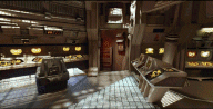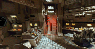 Ein Blick hinter den Captains-Stuhl. Wie Du siehst, befindet sich dort ein weiterer Stuhl. Die Sternenflotte sieht diesen für Personen vor, die sich im Zusammenhang mit diplomatischen oder Überwachungsmissionen an Bord befinden. Links und rechts hinten befinden sich wissenschaftliche Stationen.