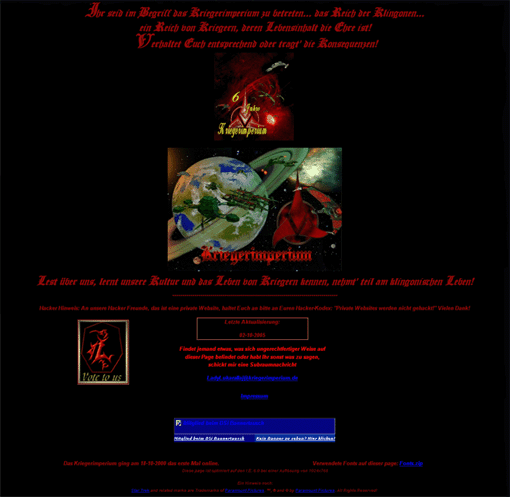 Nach sehr langer Zeit bekam das Kriegerimperium wieder mal ein neus Styling, die Eingangseite wurde dabei nicht ausgesparrt. Die hier zu sehn ist, hatte sehr lange zum Kriegerimperium eingeladen. Zeiten und Geschmäcker ändern sich, daher ist diese Seite nun eine Datei in der Abteilung Nostalgie.